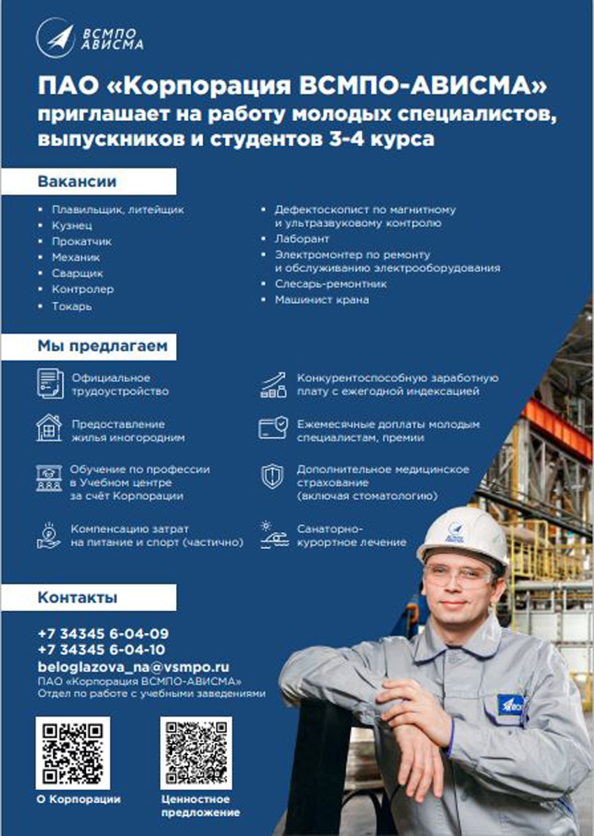 ПАО "Корпорация ВСМПО-АВИСМА" приглашает на работу выпускников и студентов 3-4 курса образовательных учреждений среднего профессионального образования.